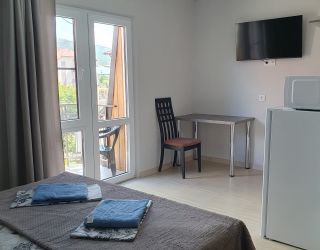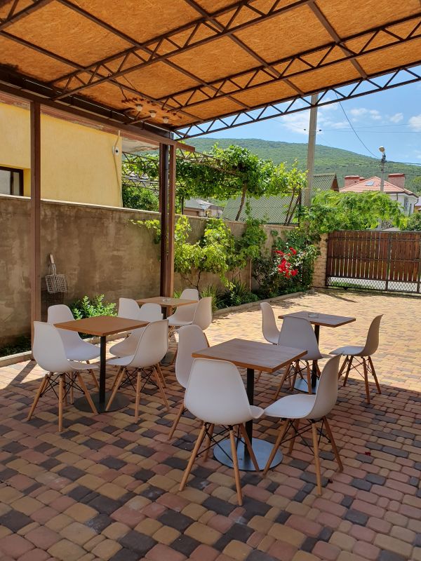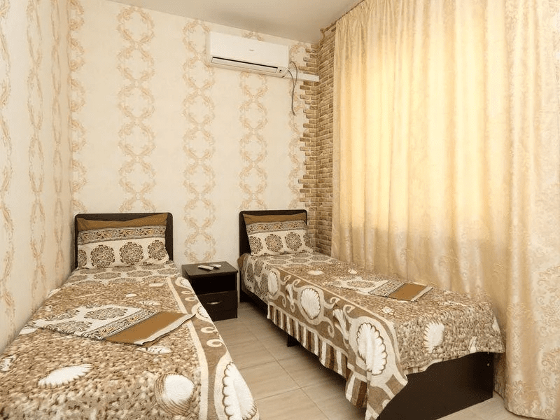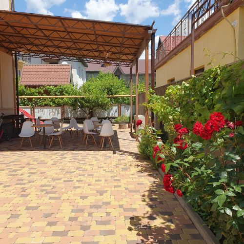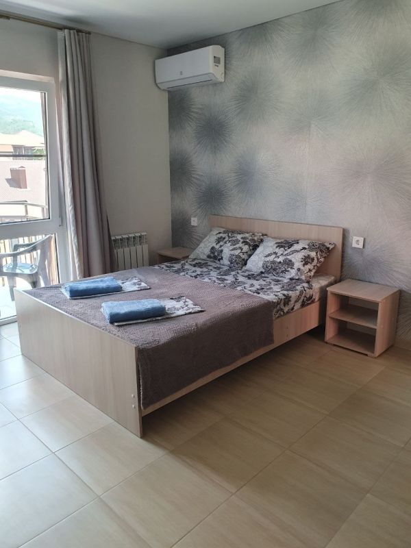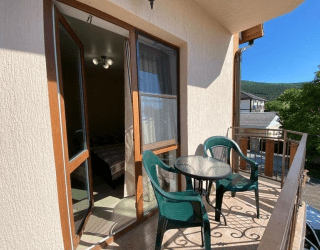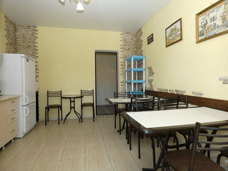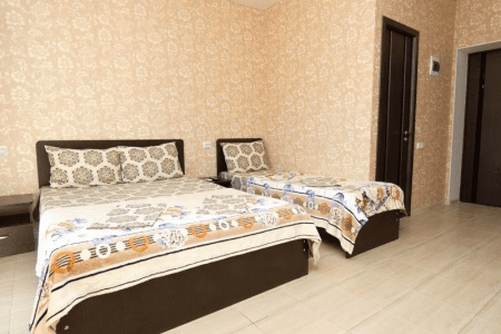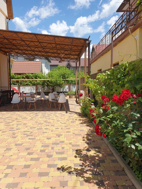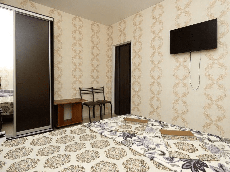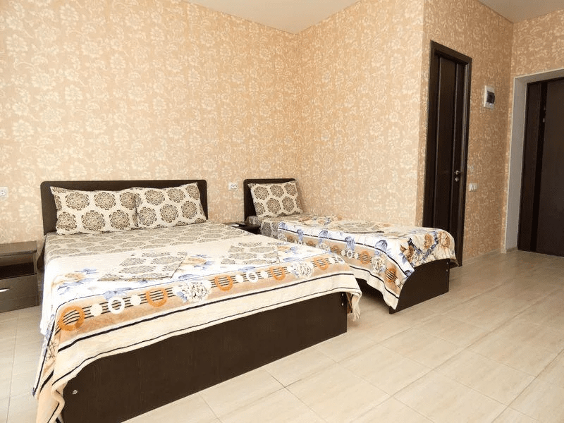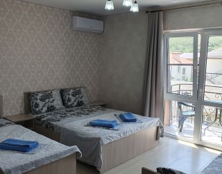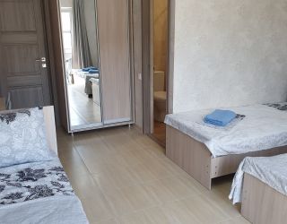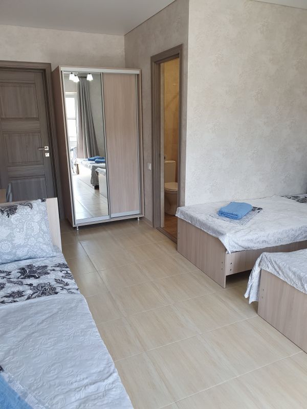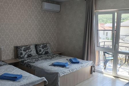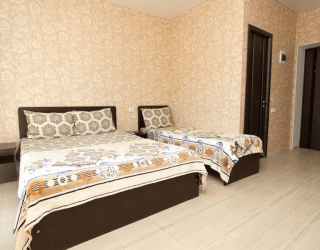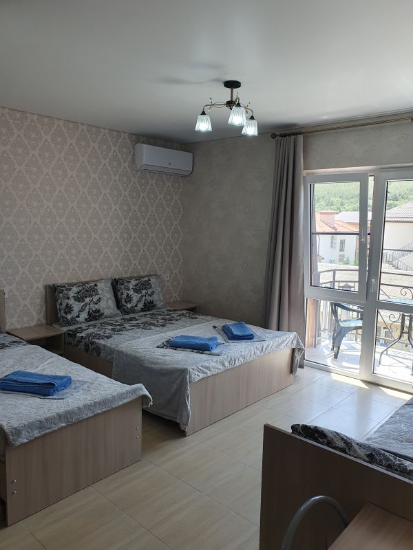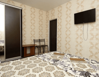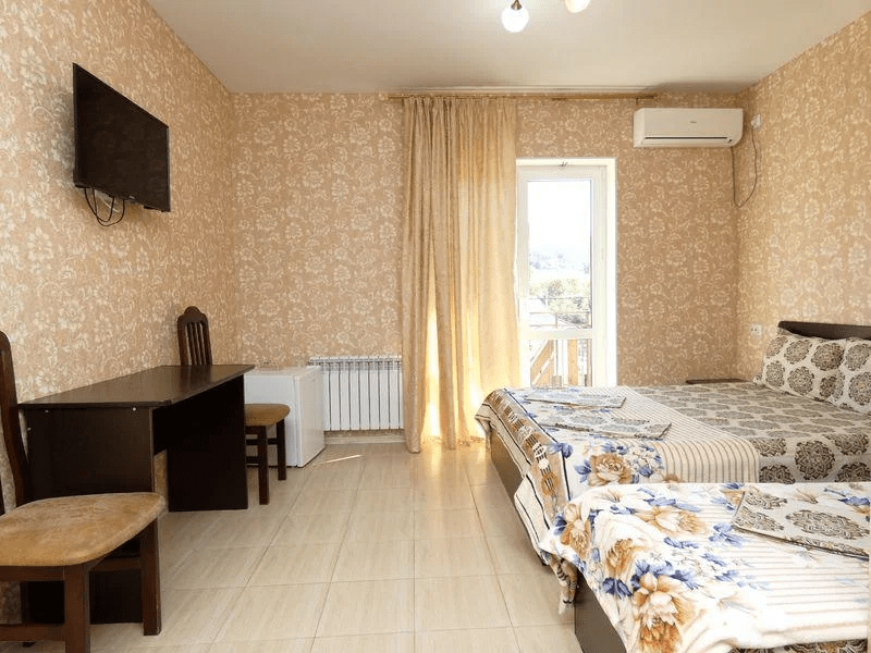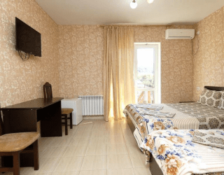 Новые просторные, оснащенные всем необходимым номера сделают отдых комфортным и приятным. В каждом номере есть комфортный спальный гарнитур, шкаф для одежды, кондиционер, телевизор, собственный санузел с душем, балкон. На этаже имеется общая кухня со всем необходимым для самостоятельного приготовления пищи, а также гладильная доска с утюгом и стиральная машина (за дополнительную плату). На территории расположе большой двор, под навесом зона отдыха, есть мангальная зона, а так же детская площадка. А приобрести необходимые продукты питания и промышленные товары можно в магазине на территории гостевого дома.